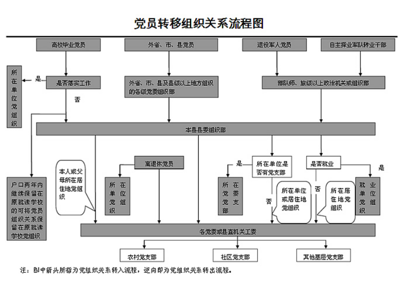 大中专毕业生、复转军人中的党员,已落实了工作单位的,应及时将组织关系转到所去单位党组织。因某些原因,一时还不能落实工作单位的,可将其组织关系转到本人、配偶或父母居住地党组织。