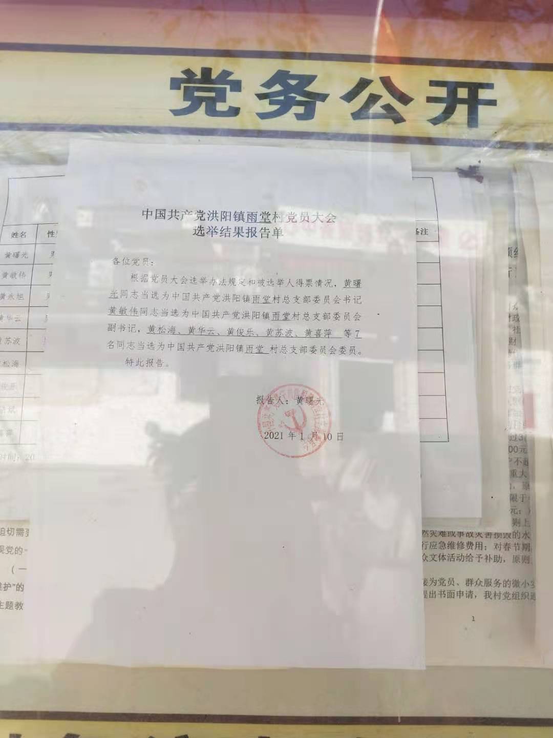 中国共产党洪阳镇雨堂村党员大会选举结果报告单