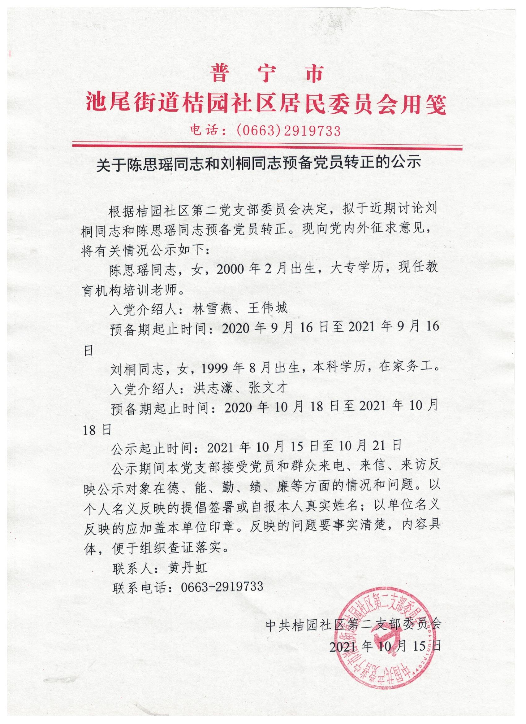 关于陈思瑶同志和刘桐同志预备党员转正的公示