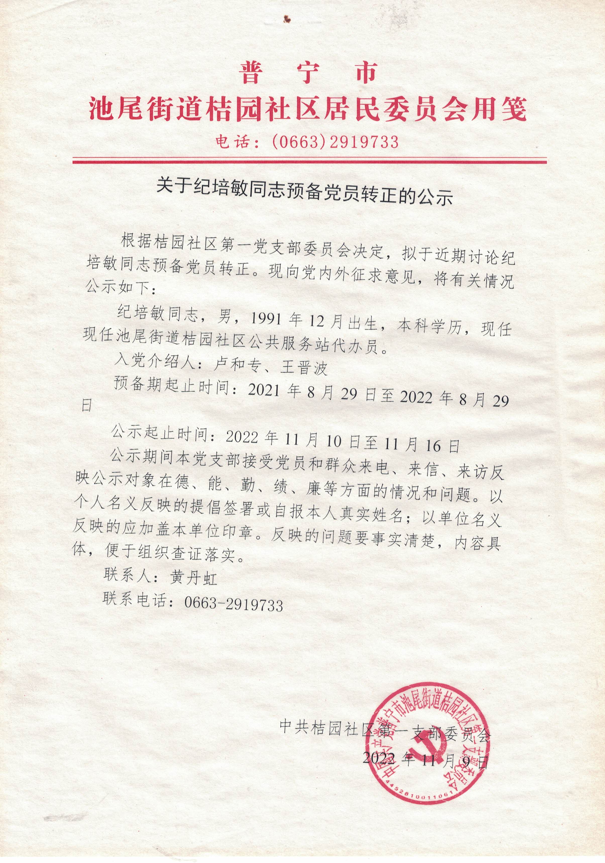 关于纪培敏同志预备党员转正的公示