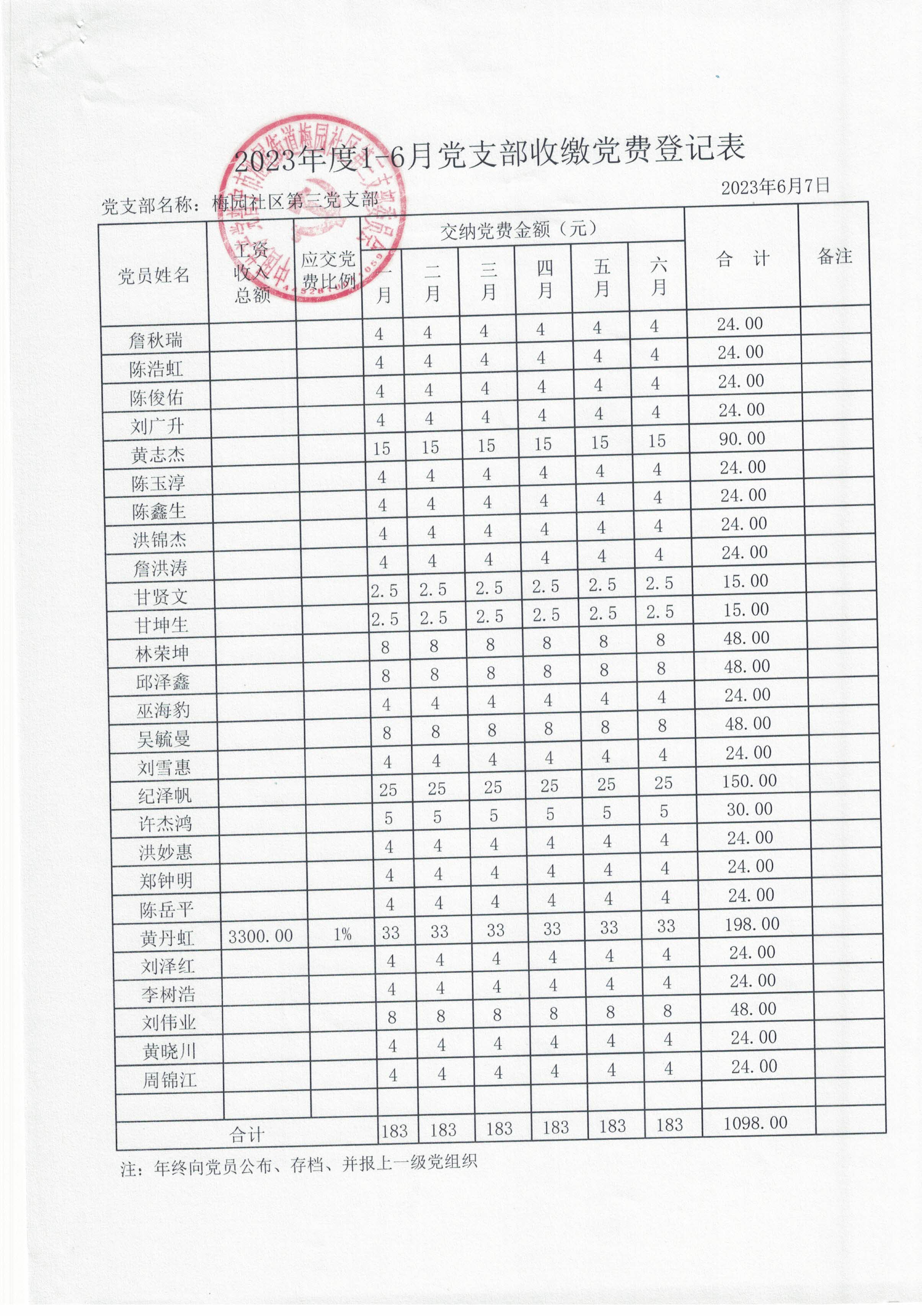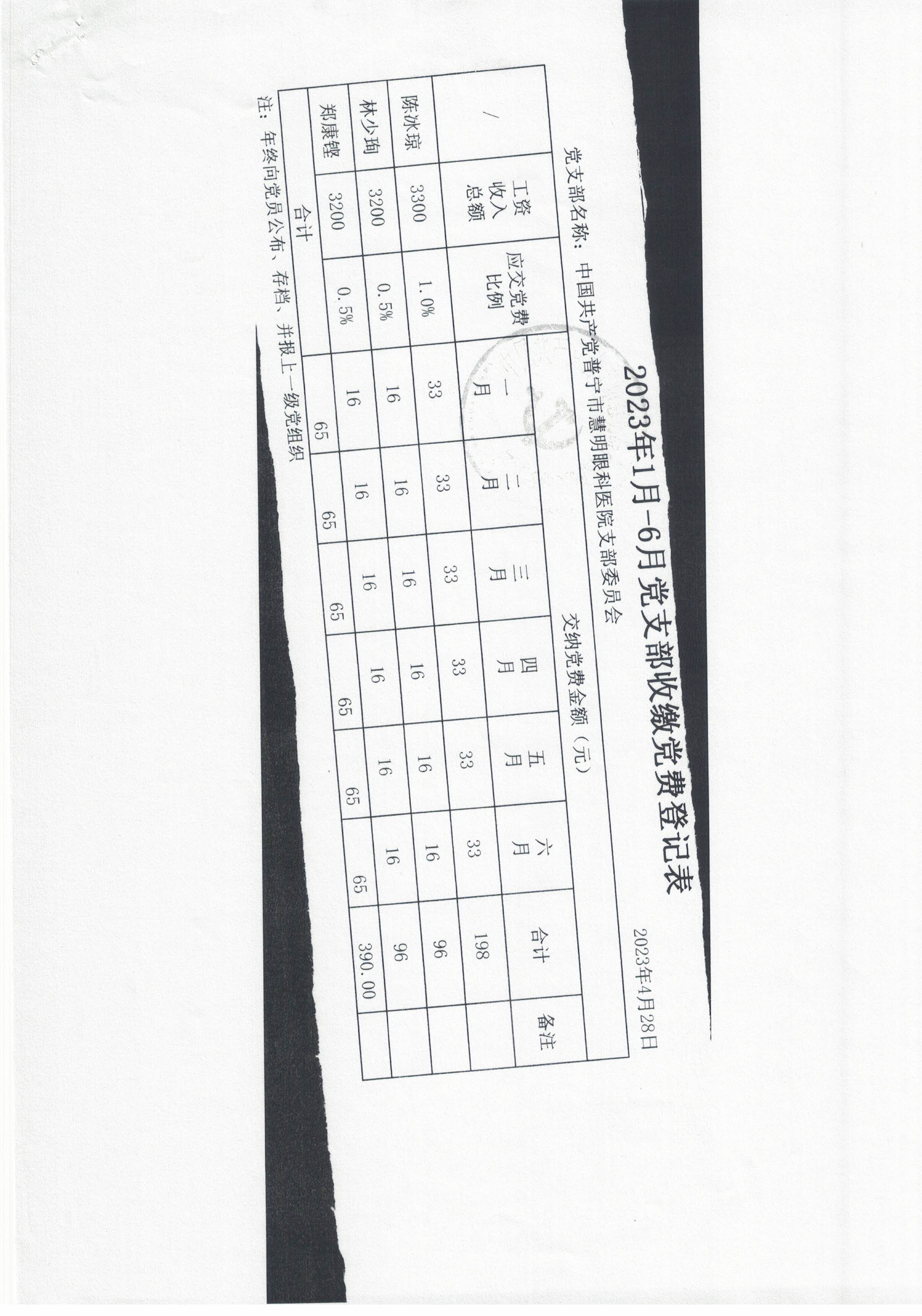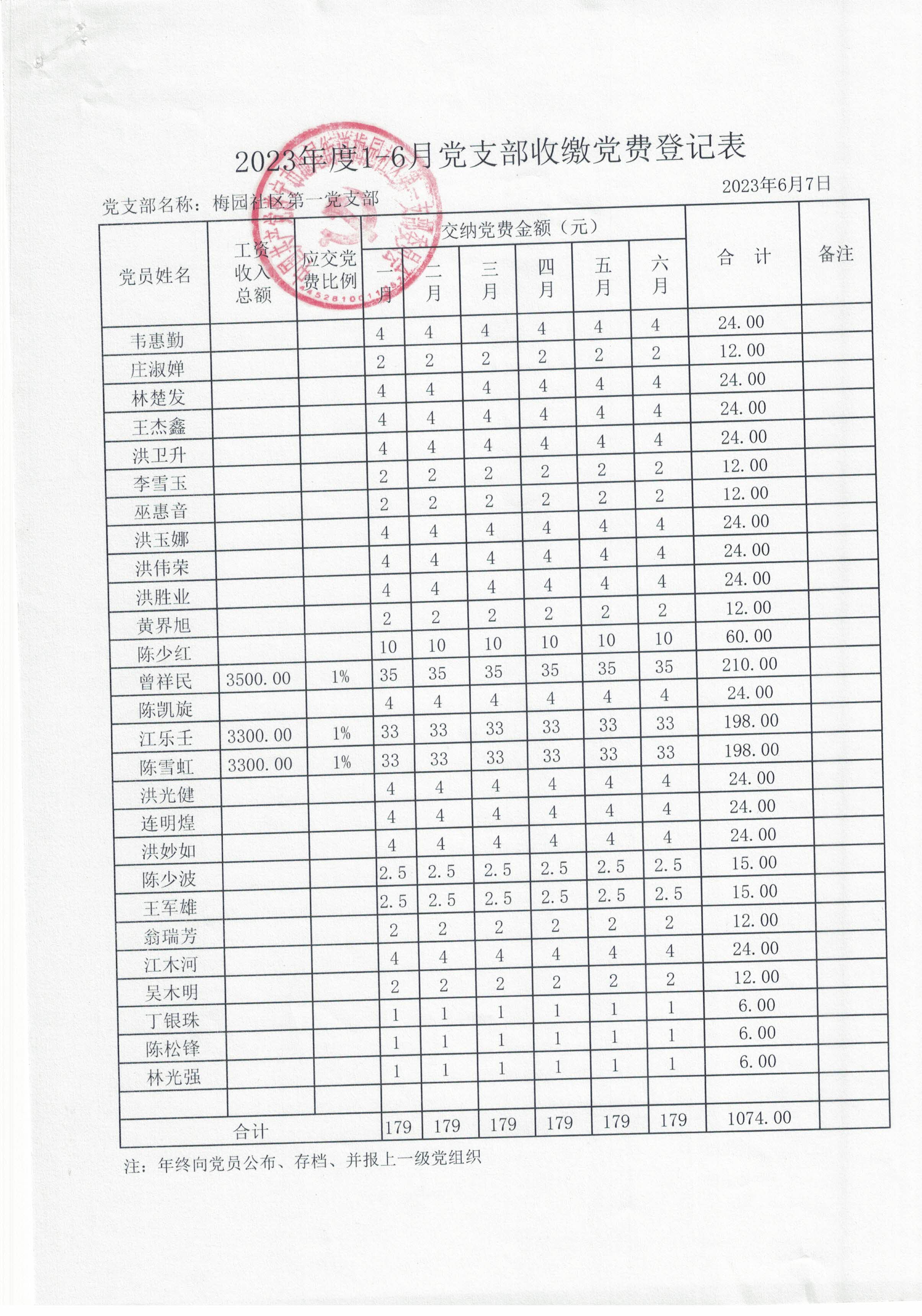 年度党支部收缴党费登记表