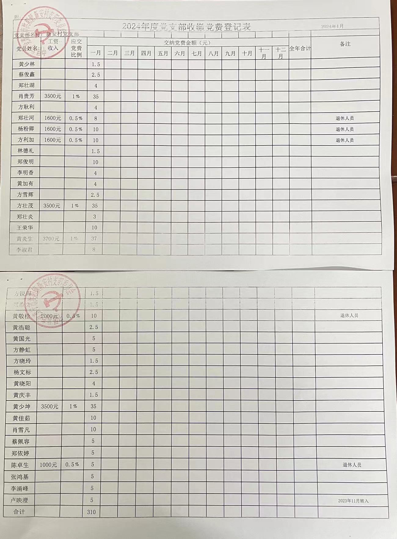 2024年度1月份新安村党支部收缴党费登记表
