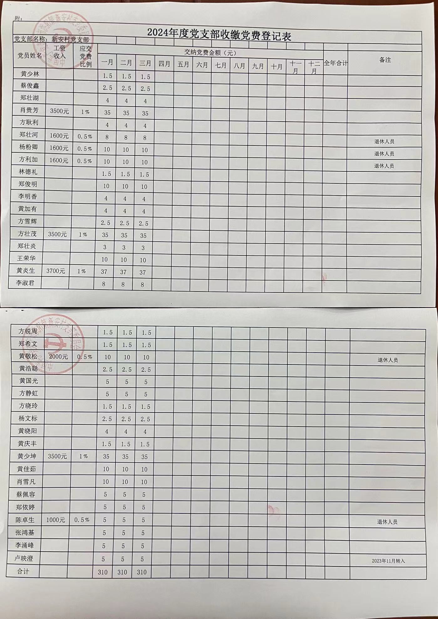 2024年度3月份新安村党支部收缴党费登记表