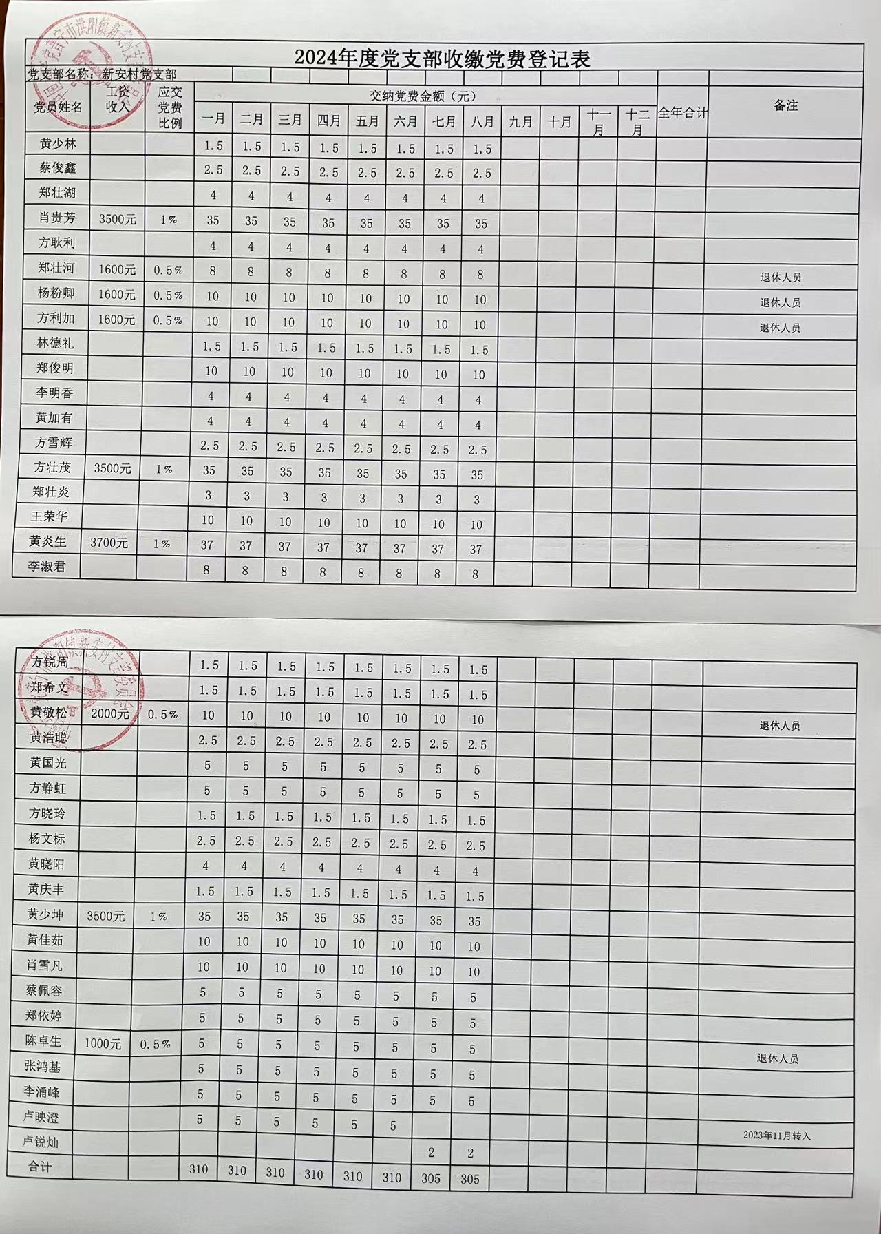 2024年度8月份新安村党支部收缴党费登记表