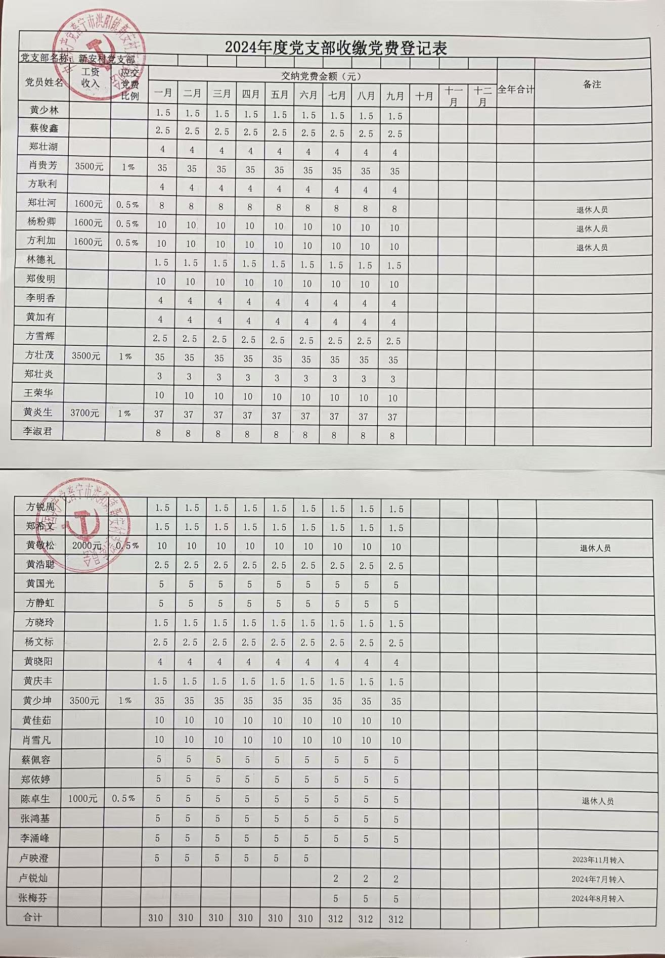2024年度9月份新安村党支部收缴党费登记表