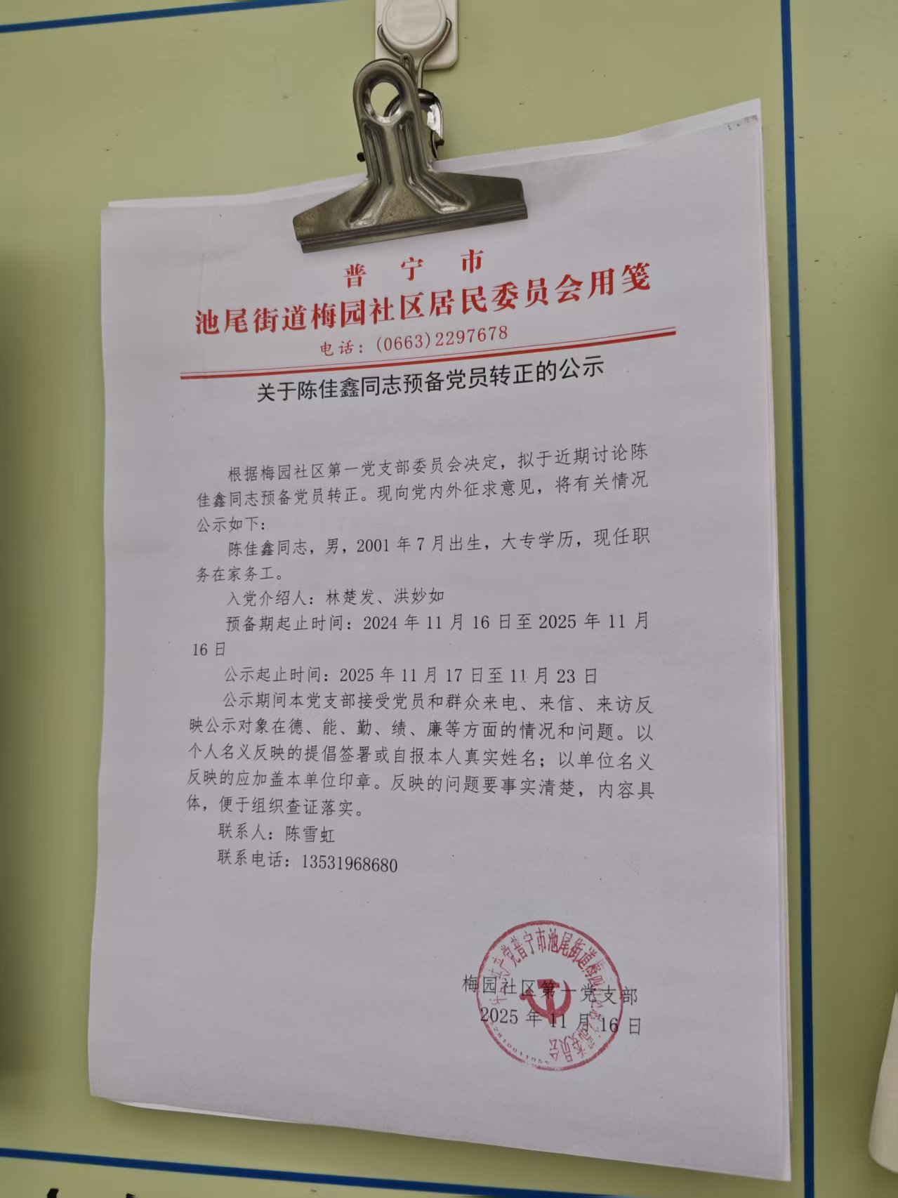 关于陈佳鑫同志预备党员转正的公示