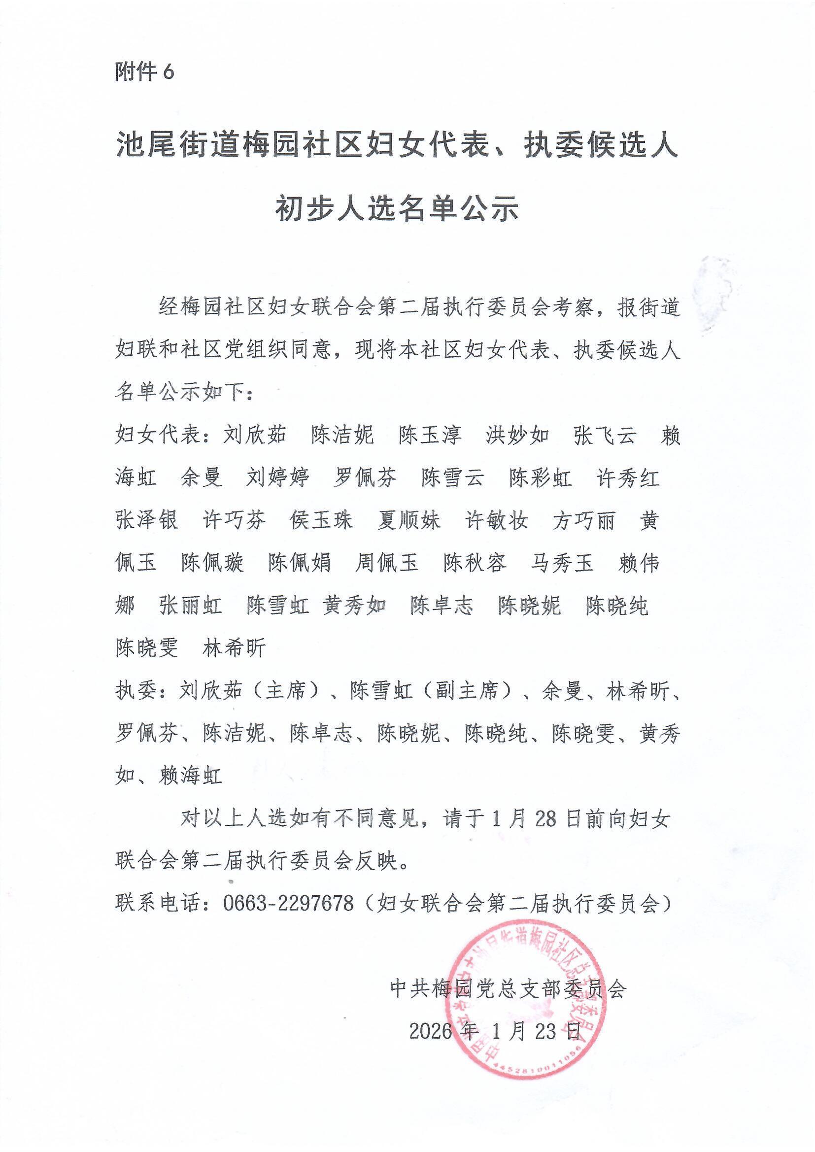 池尾街道梅园社区妇女代表、执委候选人初步人选名单公示